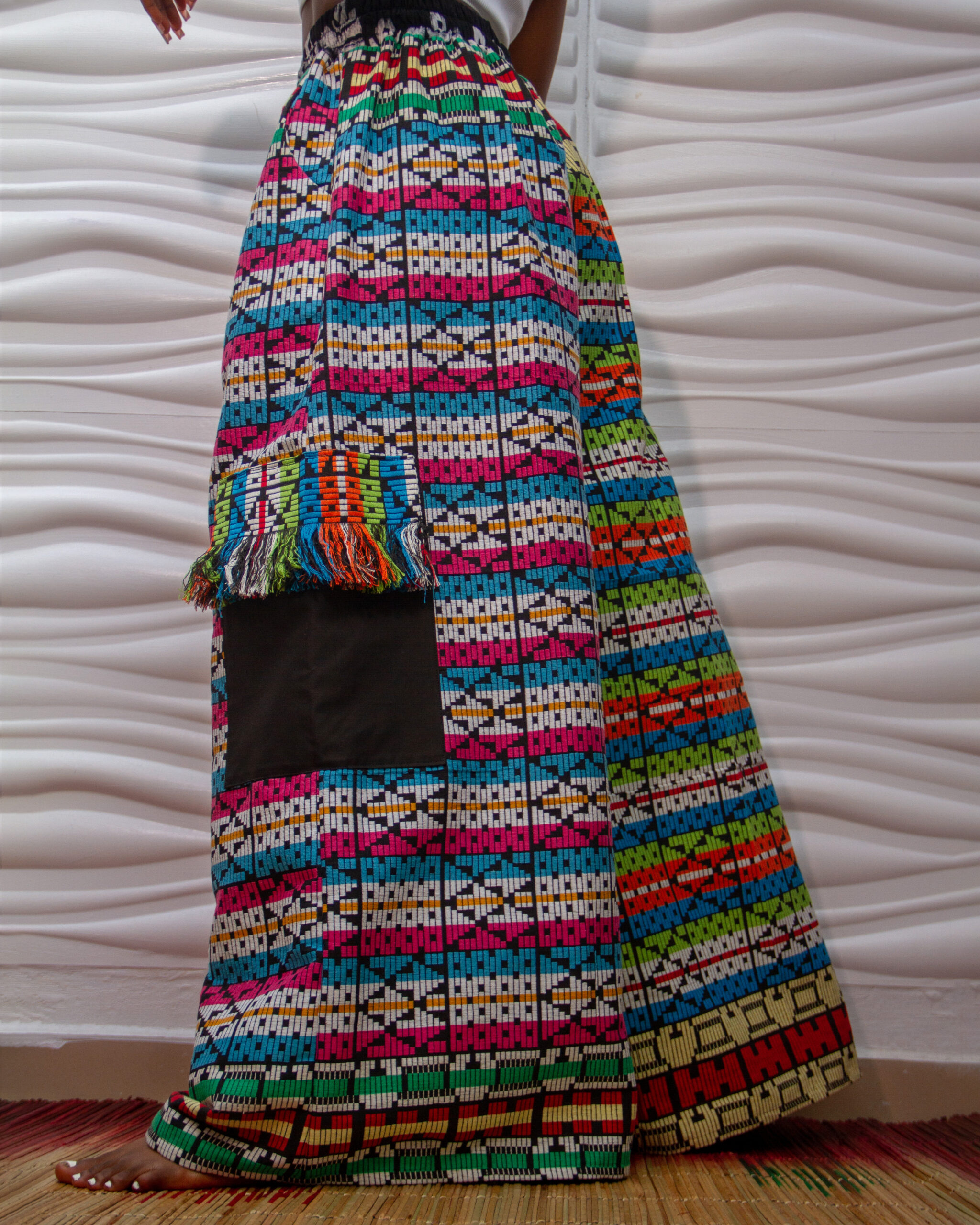 High-waisted wide-leg pants are woven with a vibrant multi-colored mosaic pattern and feature functional black patch pockets with fringe detailing for an effortless look.