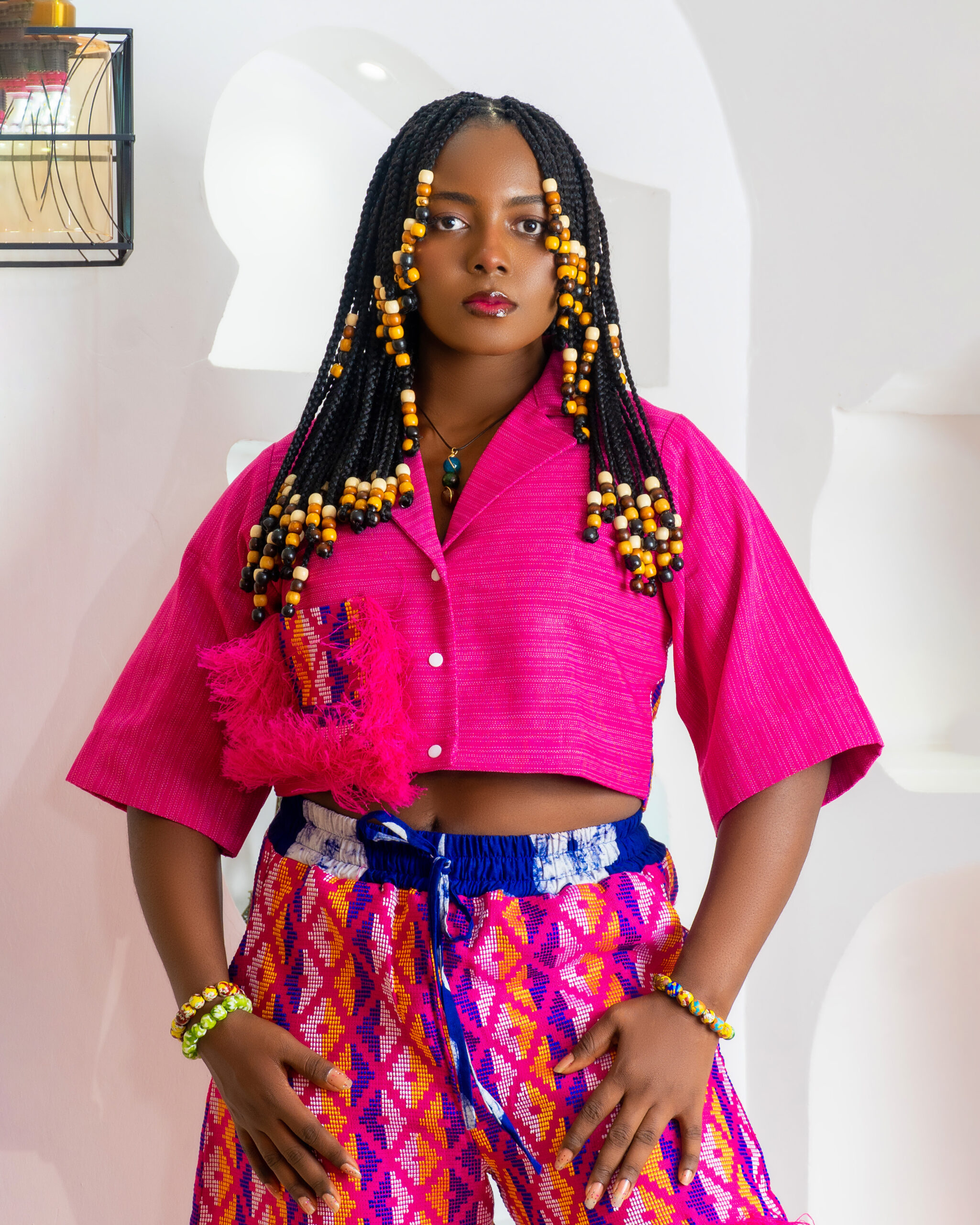 Tags: artisanal style, cropped shirt, drawstring waist, fabsafrica, fringe trim, geometric print, hand-woven fabric, pink and magenta, resort wear, statement outfit, two-piece set, wide-leg pants
